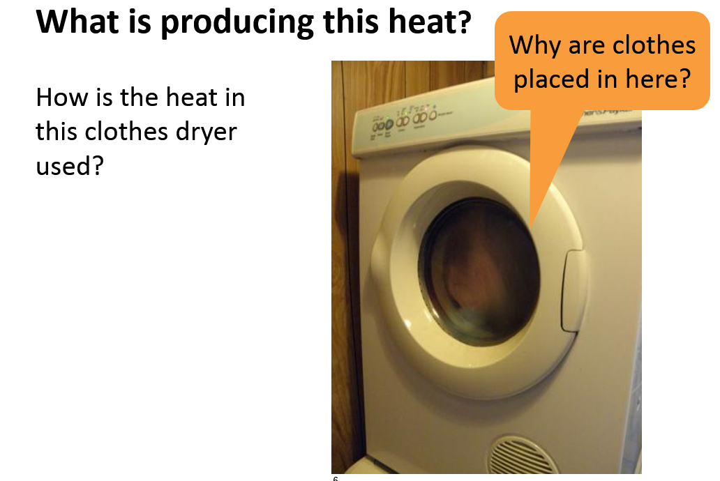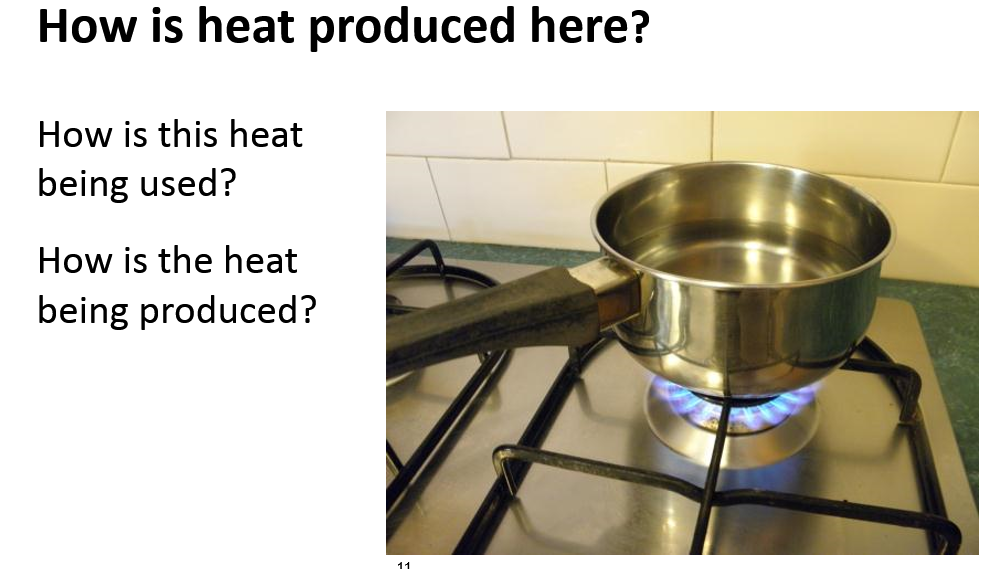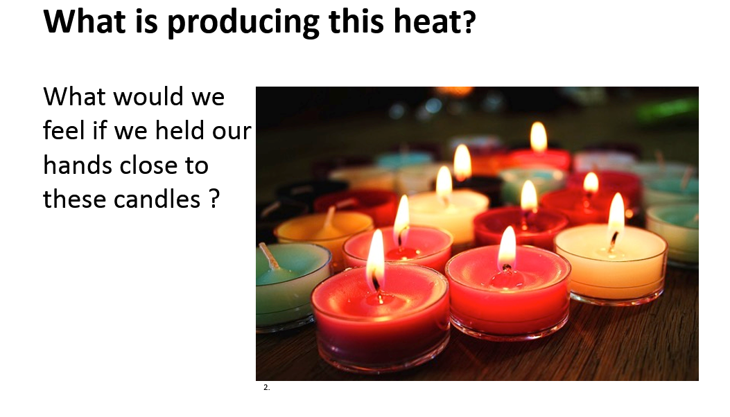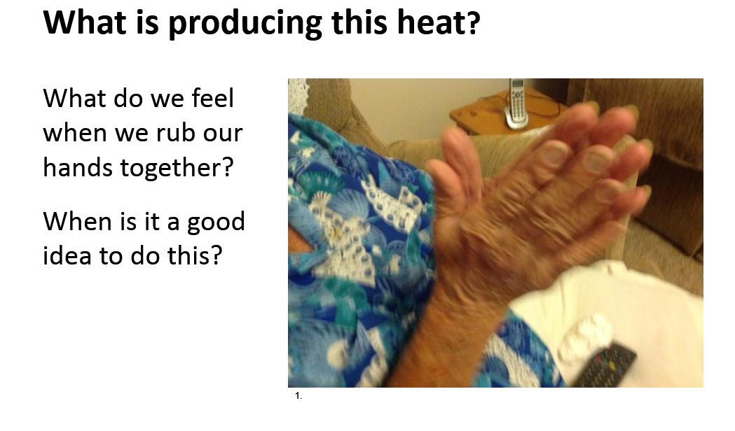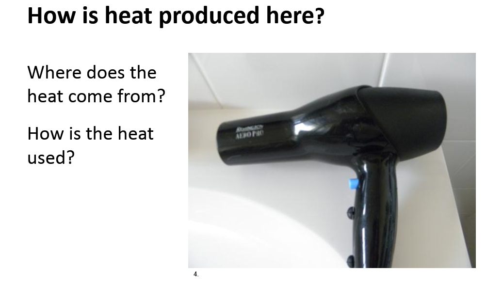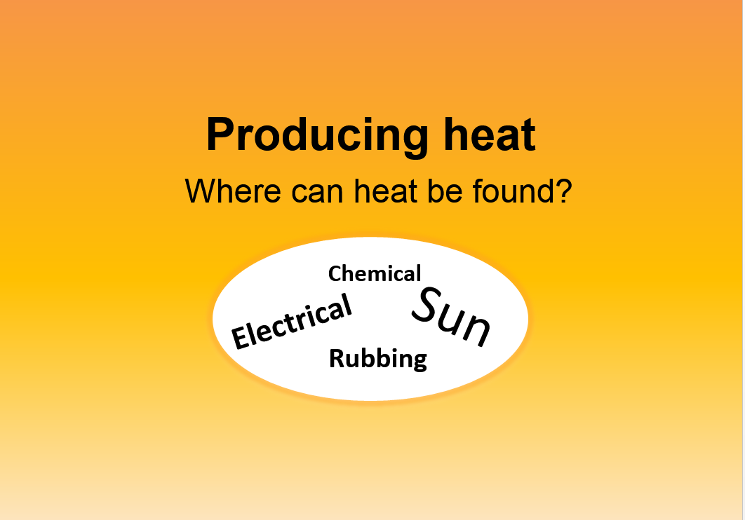 HINT: The four possible methods of heat production are Electrical; Sun(light); Friction(rubbing movement) and Chemical (burning).